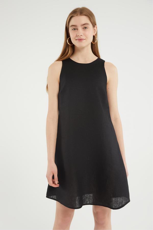Doğal keten ile stilinde ferahlık. Sade tasarımını %100 ketenin eşsiz konforuyla buluşturan kolsuz a form mini elbise, yaz akşamlarında zarif siliüetine eşlik edecek.