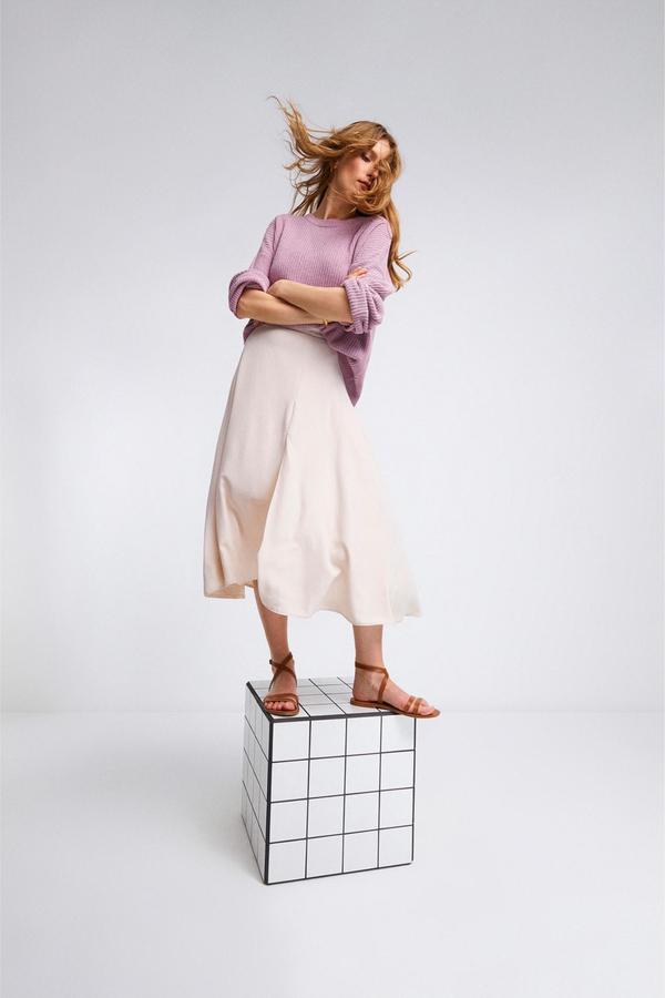 Mudo Collection etek modelleri arasında yırtmaç detaylı, yüksek bel midi kloş etek, a kesimi ve ipeksi dokusuyla dikkat çekiyor. Sade tasarımıyla dikkat çeken a kesim midi eteği düz taban sandaletlerle birlikte kullanabilir, topuklu ayakkabılarınızla birlikte daha feminen bir görünümü yakalayabilirsiniz.