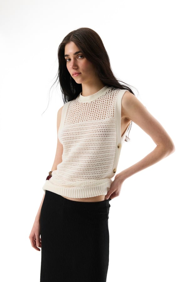 AJURLU YANLARI DÜĞMELİ KOLSUZ KAZAK