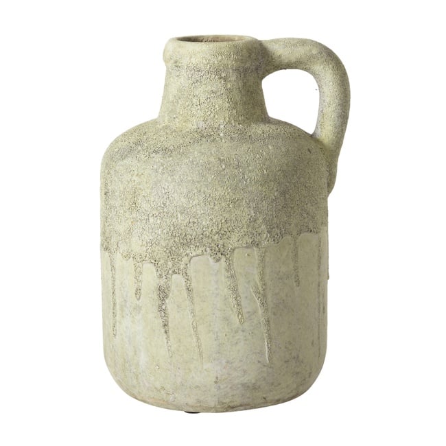 Pürüzlü seramik dokusu ve eskitilmiş yüzeyi, vazoya doğal ve rustik bir karakter kazandırır. Yuvarlak hatları, fonksiyonel tutma sapı ve alt kısmındaki damla desenli kabartmalarıyla öne çıkar. İster tek başına dekoratif bir obje olarak konsol, sehpa veya raf üzerinde sergileyin, ister taze veya kuru çiçek aranjmanlarınızla tamamlayın; ALVIN vazo, bulunduğu her köşede otantik bir odak noktası oluşturur.