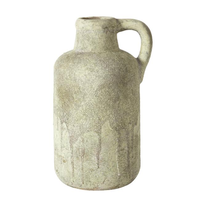 Pürüzlü yüzeyi ve mat dokusu, vazoya el yapımı hissi veren rustik bir karakter kazandırır. Yuvarlak hatlı gövdesi, üzerindeki özgün akan boya efekti ve fonksiyonel tutma sapı gibi detaylara sahiptir. İster tek başına heykelsi bir obje olarak kullanın, ister mevsimin taze veya kuru çiçek aranjmanlarıyla sergileyin; Alvin vazo, konsol, yan sehpa veya kitaplık gibi alanlarda doğal ve sıcak bir atmosfer yaratır. Otantik duruşuyla evinizin farklı köşelerinde dekoratif bir odak noktası oluşturur.