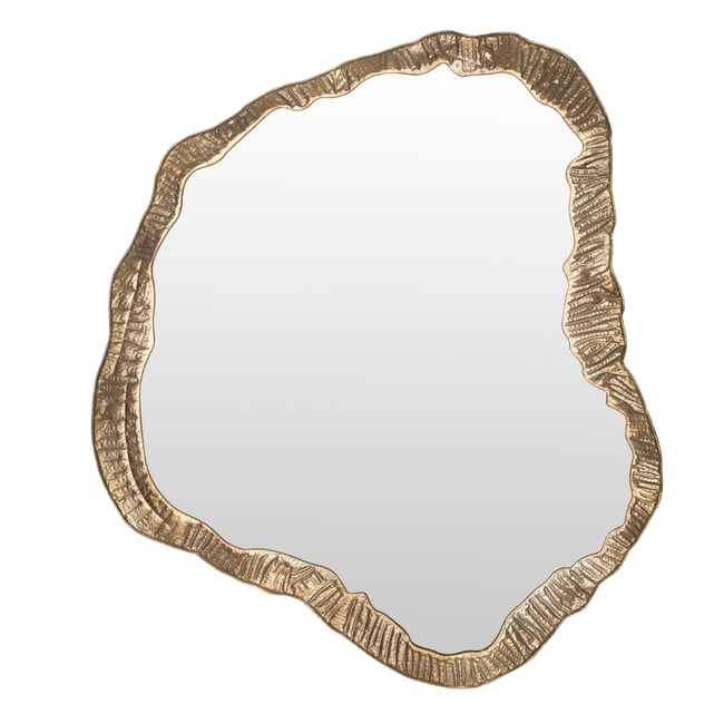 Tasarımın karakterini belirleyen metalik altın çerçeve, üzerindeki belirgin dokusuyla ürüne derinlik ve zengin bir görünüm kazandırır. Pürüzlü yüzeyi ışığı farklı açılardan yansıtarak dinamik bir şıklık oluşturur. Düzensiz ve akışkan hatları sayesinde antre, salon veya yatak odası gibi farklı mekanlarda sanatsal bir odak noktası yaratır. Hem mekan algısını yansımalarıyla genişletir hem de dekorasyona sofistike bir zarafet ekler. Modern ve eklektik dekorasyon tarzlarını tamamlayan bu altın çerçeveli ayna, mekanınıza estetik bir imza atar.
