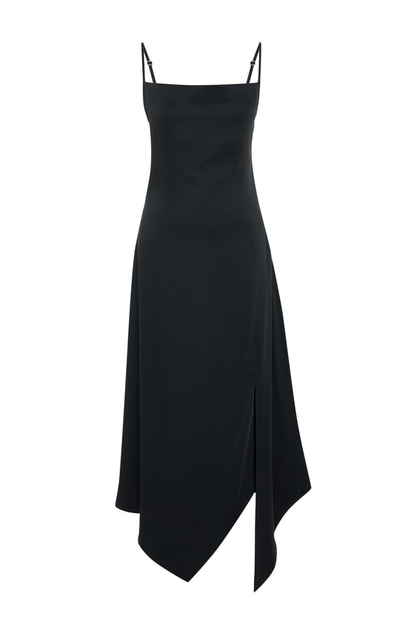 ASİMETRİK KESİM KOLSUZ MİDİ ELBİSE