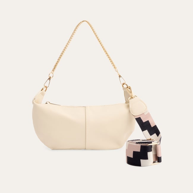 Çantada iki farklı askı seçeneği bulunur: Altın renkli zincir askı, klasik ve şık kombinlerde zarif bir görünüm sunarken; renklerin yer aldığı desenli kumaş askı ise günlük ve dinamik stiller için tercih edilebilir. Çıkarılabilir askılar sayesinde çantanızı tarzınıza ve ihtiyacınıza göre kişiselleştirebilirsiniz. Üst kısmındaki fermuarlı ana bölme, kişisel eşyalarınızı güvenle saklamanızı sağlar ve pratik bir kullanım sunar.