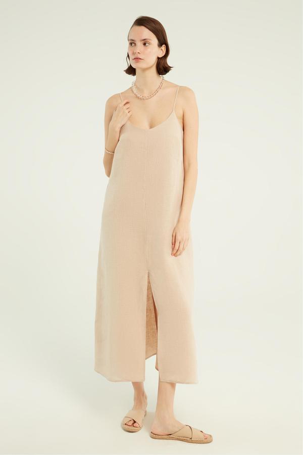 Mudo'da keten zamanı. Doğal ketenin ferah tutan özelliği ile yaz aylarında vazgeçilmezin olacak yırtmaçlı uzun elbise, yalın tasarımıyla dikkat çekiyor. İnce askıları, düz kesimiyle zarafeti yansıtan keten elbise, farklı renk seçenekleriyle Mudo'da.