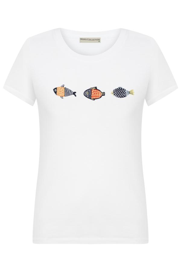 Mudo ile basic şıklığını tamamla. Üç farklı balık deseniyle sizi okyanus tınılarını marin teması bünyesinde buluşturan bisiklet yaka beyaz tişört ile şehrin sokaklarında, tatiller, sahilde tarzını yansıtabilirsin. Mini şort, pantolon ve jean eteklerle mavi tonlarını kombinlerinde buluşturabilirsin. Boynuna bağlayın fularla etkili bir görüntü yaratabilir, hasır şapka ve hasır çantalarla kombinini tamamlayabilirsin.