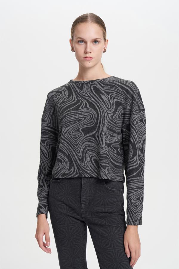 Mudo ile modern kadını stiline yansıt! Yumuşak dokusu, soyut desenleriyle tasarıma hareket katan bisiklet yaka baskılı uzun kollu kazak ile jean etek ve pantolon modellerini kombinleyerek günlük şıklığı oluşturabilirsin.