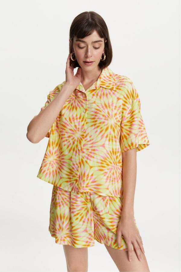 %100 viskoz kumaştan üretilen desenli kadın gömlek eşsiz dokusuyla öne çıkıyor. Renkli soyut desenleriyle ile tasarımına hareket katan kadın kısa kollu gömlek modelini Mudo Desenli Viskoz Şort ile kombinleyebilirsin.