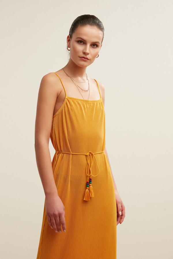 BELDEN BAĞLAMALI İNCE ASKILI PİLELİ MİDİ ELBİSE