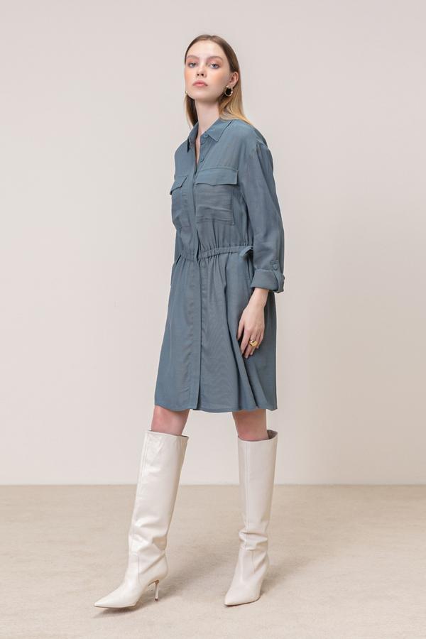 BELİ LASTİKLİ MİNİ GÖMLEK ELBİSE
