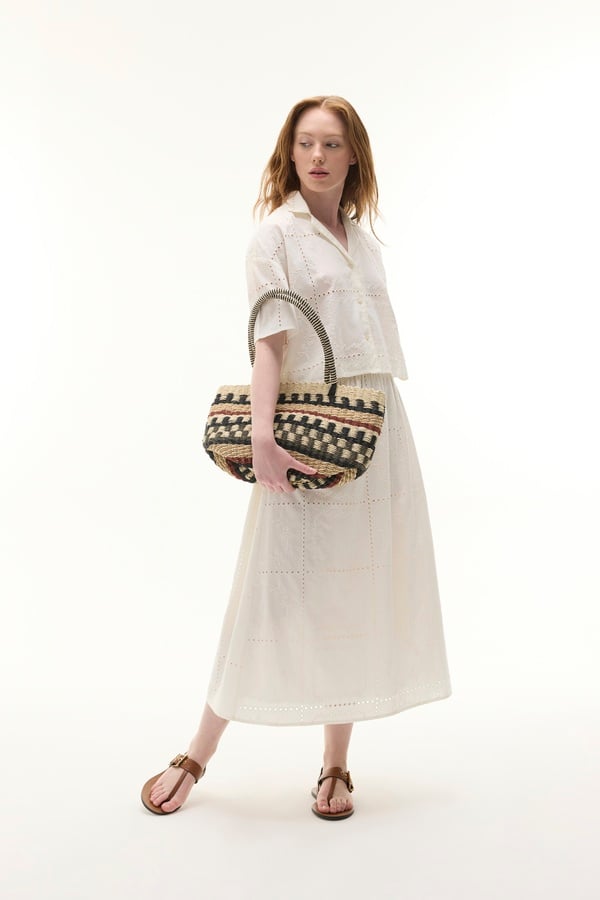 Zarif nakış detaylarıyla görünümünüzde şık ve feminen bir duruş sergileyecek olan beli lastikli nakışlı kloş midi etek, gardırobunuzun favori parçalarından olacak. Sade güzelliği büyüleyici bir stile çeviren etek; beli lastikli kesimiyle konforu ön planda tutarken, kloş formu feminen görüntüyü bir kez daha vurguluyor. Nefes alan hafif kumaşı ile sıcak günlerde bile kombinlerinizin vazgeçilmezi olacak eteği snekarlar ile günlük şıklığınıza, topuklu ayakkabılar ile gece stilinize uyarlayabilirsiniz.