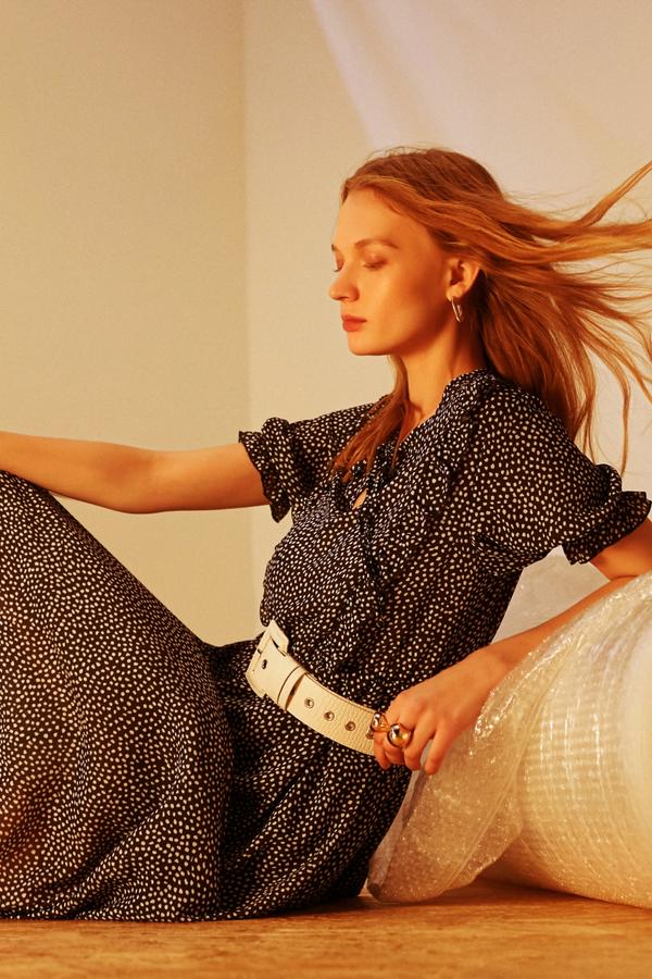 BELİ LASTİKLİ VOLANLI MİDİ ELBİSE