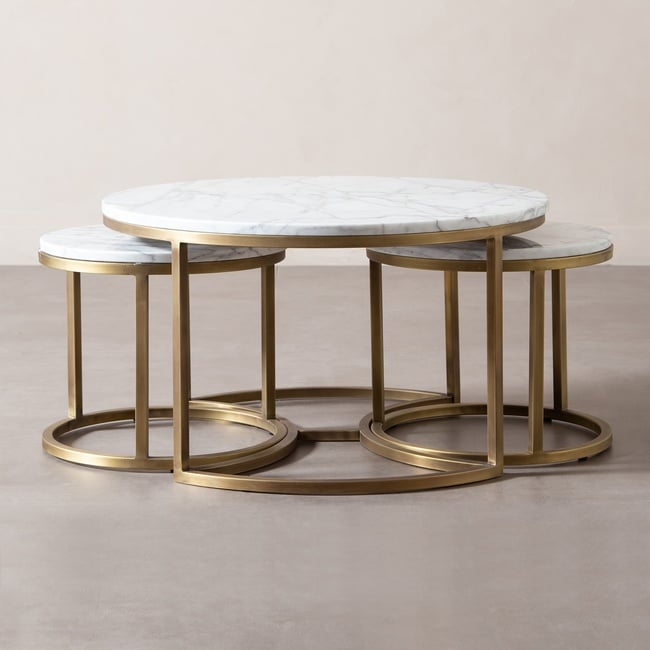 Mudo Concept sehpa modelleri ile orta sehpa ve yan sehpa ihtiyacını aynı anda karşılayın! Bella Orta Sehpa üç parçadan oluşuyor. İki küçük ve bir büyük parçası bulunan sehpa, küçük parçaların iç kısmına girmesiyle çok az yer kaplıyor. Üst kısmı doğal bir ürün olan mermerden oluştuğu için her üründe ton ve desen farklılıkları göze çarpıyor. Küçük parçaları ister serviste ister büyük parçanın yanında dekoratif amaçlı kullanabilir, evinize şık bir doğallık katabilirsiniz.