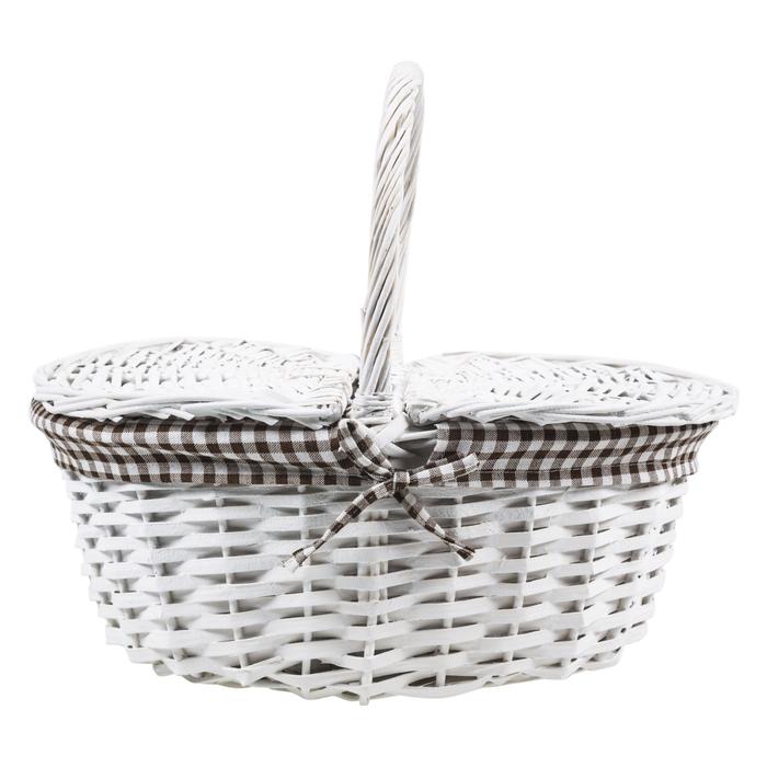 Beyaz renkli, kapaklı hasır sepet uzun saplarıyla rahatlıkla taşınabilir.Çift taraftan açılma özelliği vardır.
