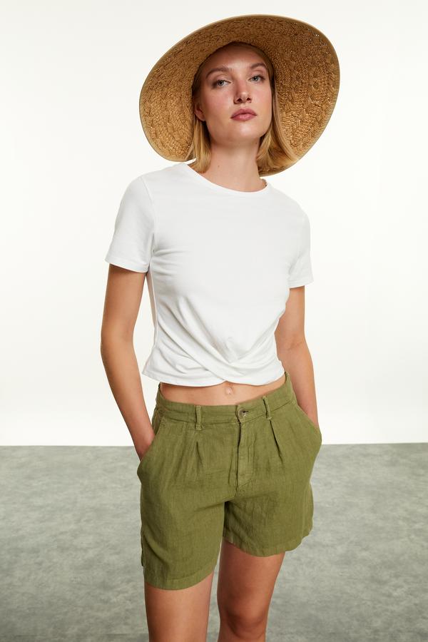 Yazın enerjisi bisiklet yaka kruvaze t-shirt ile kombinlerinize taşınıyor. Şıklığı ve rahatlığı aynı anda sunan t-shirt modeli, ince işlenmiş detayları ve zarif tasarımıyla stilinizin dikkat çeken parçalarından biri olacak. Jean şort ve pantolonlarınızla, aynı zamanda eteklerinizle kombinleyebilirsiniz.