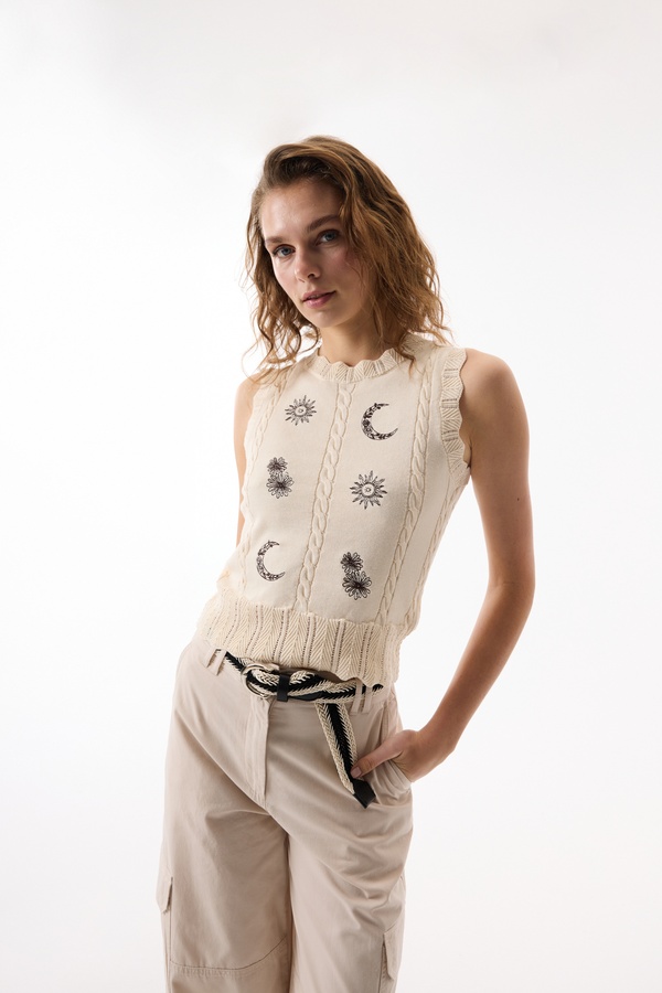 Minimalist tasarımı ve feminen nakış detayıyla öne çıkan nakışlı bisiklet yaka süveter, her mevsim gardırobunuzun yıldızı olacak. Yumuşak dokulu triko kumaşı sayesinde gün boyu konfor sunan model, nefes alabilen yapısı sayesinde serin bir kullanımı beraberinde getiriyor. Bisiklet yaka kesimi sayesinde hem gömleklerle, hem de tek başına kombinleyebileceğiniz süveter şıklığınızı bir adım ön plana taşır. İster ofiste, ister günlük yaşantınızda rahatlıkla kombinleyebilirsiniz.