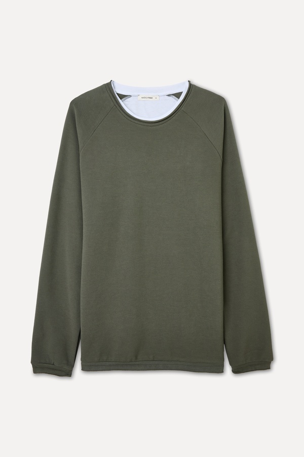 Fitilli dokusu ve raglan kol kesimi, omuzlarda modern bir duruş sağlarken hareket özgürlüğünü destekler. Manşetler ve etek ucundaki ribana detayları ise ürünün formunu korumasına yardımcı olur ve bütünlüklü bir görünüm sunar. Jean pantolonlar veya chino'larla kolayca kombinlenebilir, zahmetsiz bir günlük stil oluşturur.