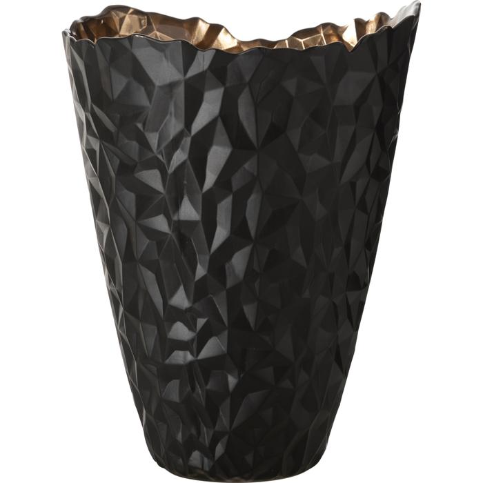 Tamamen camdan üretilen Black-Gold Vazo, siyah ile altın renginin muazzam uyumunu kristal dokusu ile yansıtıyor. Dekorasyonda asil bir görünüm arayanların gözdesi olacak vazoyu ister çiçeklerinizle, ister farklı dekoratif objelerle bir araya getirerek görsel bir şölen oluşturabilirsiniz.