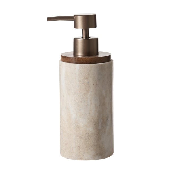 Tasarımında öne çıkan detaylardan biri, taş benzeri mat yüzeyin bronz renkli pompa ile buluşmasıdır. Pürüzsüz dokulu pompa, kullanım kolaylığı sağlarken, ekru renkli gövdeyle uyumlu bir kontrast oluşturur. Bu birliktelik, ürünün hem fonksiyonel hem de estetik açıdan dengeli bir görünüm sunmasını sağlar. Minimalist ve zamansız tasarımı sayesinde, banyo veya mutfak tezgahında sade bir şıklık yaratır. Doğal ve huzurlu bir atmosfer oluşturmak isteyenler için, taş görünümlü bu sabunluk hem pratik bir kullanım hem de dekoratif bir katkı sağlar.