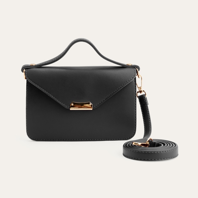Zarif rengi, ön yüzündeki altın rengi metal toka detayıyla birleşerek çantaya sade ve sofistike bir görünüm kazandırır. Zarf kapak tasarımı, eşyalarınız için güvenli bir kullanım sunarken çantanın net ve şık siluetini korur. Ayarlanabilir omuz askısı sayesinde çapraz veya omuzda rahatça taşınabilir; üstten tutma sapı ise çantanın el çantası olarak da kullanılmasına olanak tanır. Pürüzsüz ve mat dokusu, kaliteli bir görünüm sunar. İç bölmeleri, temel eşyalarınızı düzenli bir şekilde taşımanızı sağlar. Minimalist ve zamansız çizgisiyle, gündelik kombinlerden klasik elbiselere kadar geniş bir stil yelpazesiyle uyum sağlar.