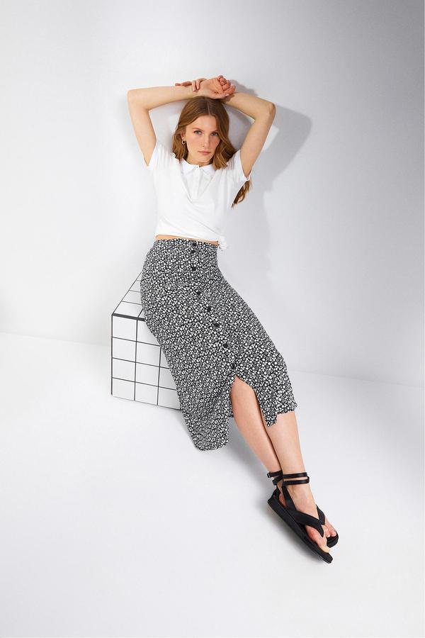 Siyah beyaz asaletini günlük ve ofis şıklığına dahil et. Çiçek desenleriyle hem sade hem de dinamik bir görünüm kazandıran midi etek düğme detaylarıyla moduna göre yeniden yorumlamanı sağlıyor. Düz sandaletlerle bilrikte kullanabileceğin midi eteği jean ceketlerinle tamamlayarak modern ve stil sahibi bir görünüme kavuşabilirsin.
