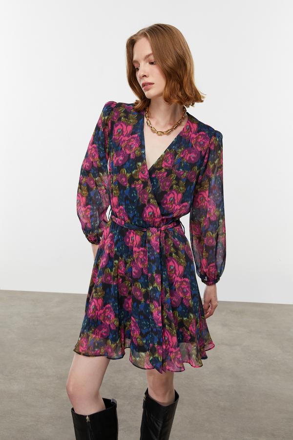 Çiçek desenli şifon kumaştan tasarlanmış kadın mini kloş elbise, zarifliği ve hafifliği bir araya getiriyor. Çiçekli desenleriyle öne çıkan mini şifon elbise, hafif dokusu ve kloş kesimiyle feminen bir tarz sunuyor.