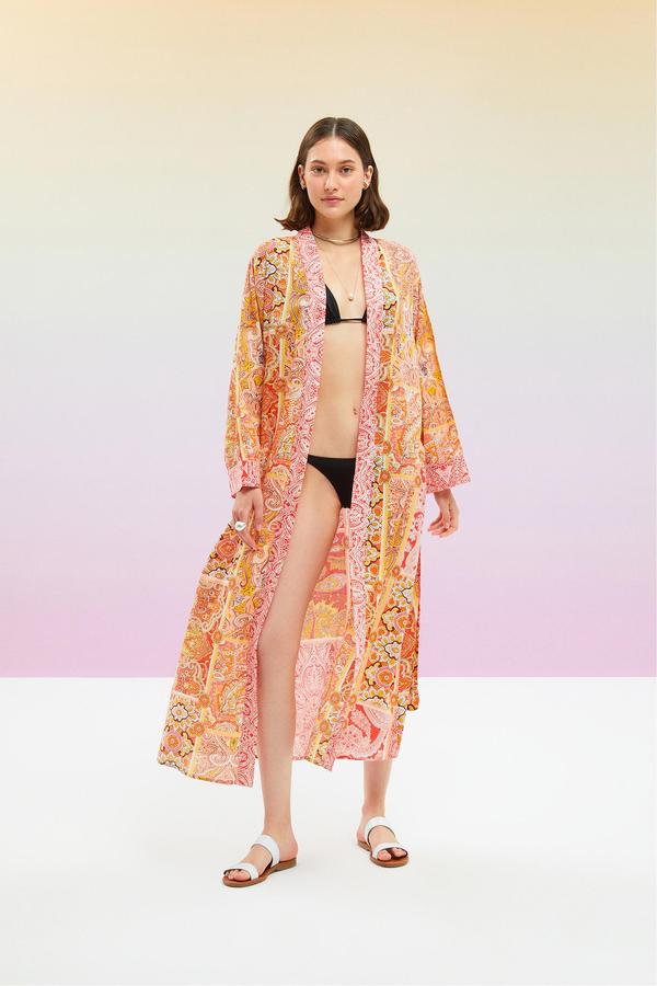 Plaj kıyafetleri arasında desenleri, tasarımı ve rahat kullanımıyla öne çıkan kimono, sahillere renk katacak. Hasır şapka ve çantalarla kombinleyebileceğin uzun plaj kimono ile iri ahşap küpeleri kullanarak görünümü güçlendirebilir, yazın enerjisini canlı tonlarıyla öne çıkan kimono ile tarzına yansıtabilirsin.