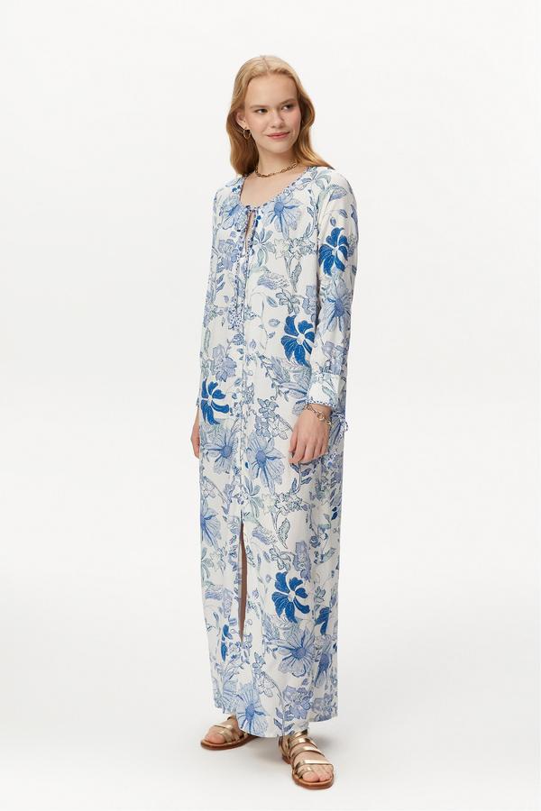 Mudo elbise modelleri ile yaz mevsiminde romantik tavrını yansıt. Mavi çiçek desenleriyle öne çıkan maxi boy elbise rahat kesimiyle yaz mevsiminde kurtarıcın olacak.