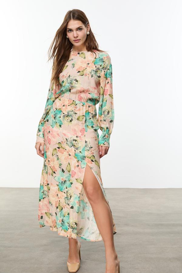 ÇİÇEK DESENLİ YIRTMAÇLI UZUN ELBİSE