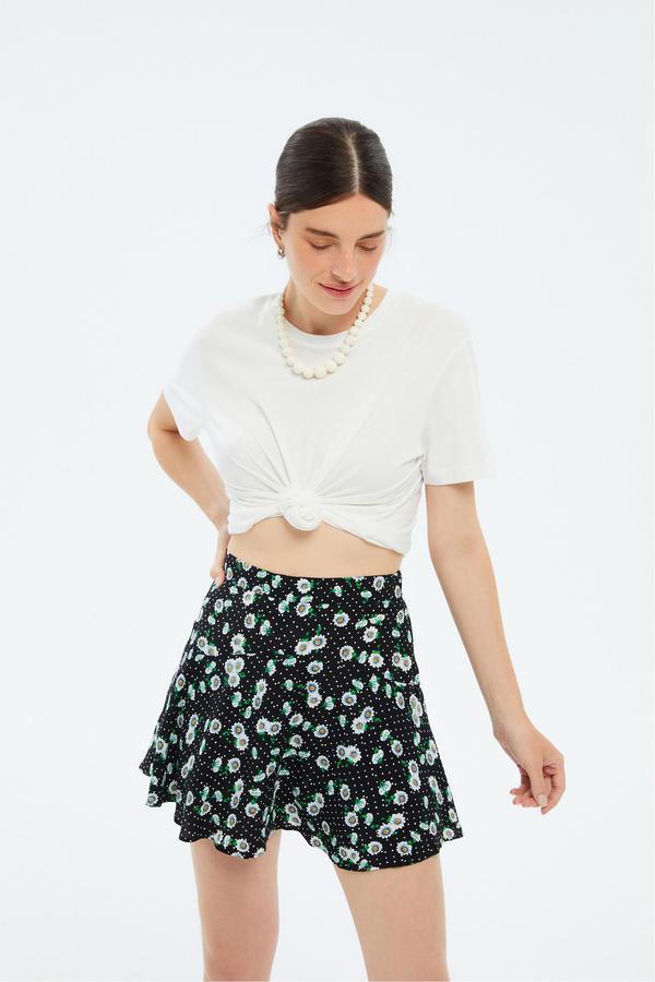 Papatya desenleriyle mini kloş etek en zarif kombinlerinizin parçası olacak. Desenli mini etek kombinlerinizi basic tişörtler ile birlikte, spor ayakkabılarla dinamik bir yorum katabilir, beyaz gömlekler ile ofis şıklığınızı oluşturabilirsiniz.