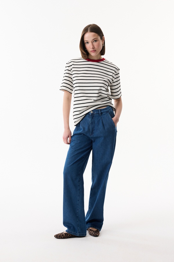 Klasik çizgilerle zamansız bir şıklık yakalayın! Çizgili bisiklet yaka kısa kollu t-shirt ile her kombininizi tamamlayabilirsiniz. Yumuak dokusu ve rahat kesimiyle gün boyu konfor sunan tişört modeli, zamansız çizgi deseni ile stilinizde modern ve dinamik bir hava oluşturuyor. Tarzını çabasız bir şıklıkla göstermek isteyenler için ideal seçim olan t-shirtü ister jeanlerle sportif bir şekilde, istersen kumaş pantolonlarla casual bir şekilde kombinleyebilirsiniz.