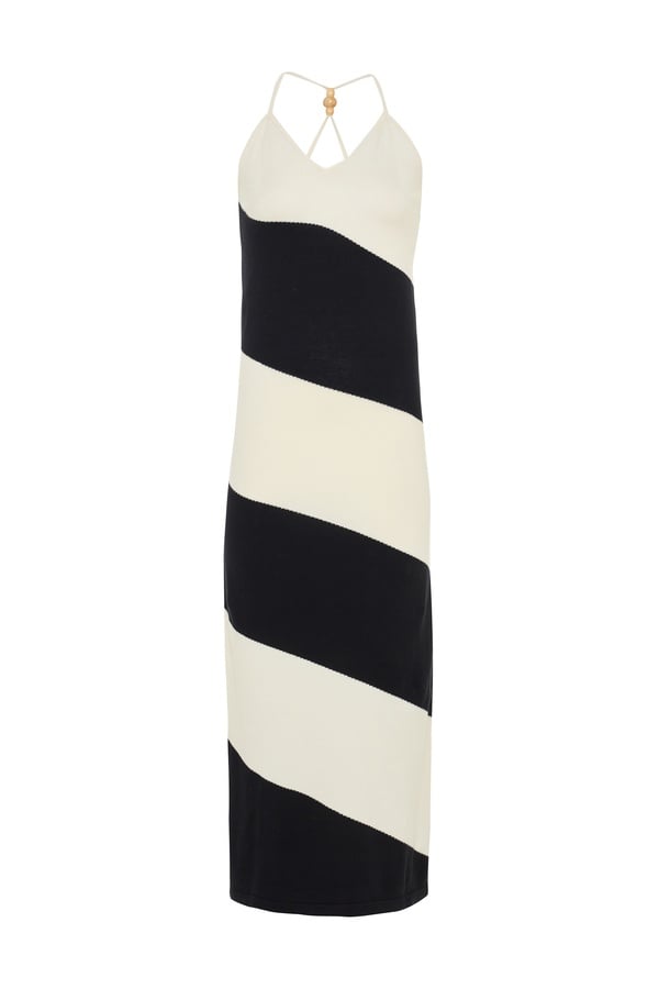 ÇİZGİLİ BONCUK ASKILI UZUN TRİKO ELBİSE