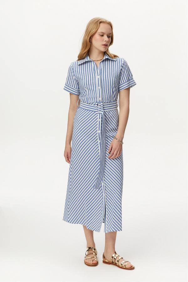 Pamuk karışımlı kumaştan üretilen maxi elbise, çizgili desenleriyle yalın tasarımına hareket katıyor. Mavinin göz alıcı tonuna yer veren gömlek elbise, kemer detayı ile bel kıvrımını ortaya çıkaracak.