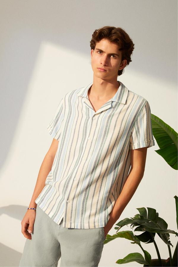 Kendine has dokusuyla dikkat çeken çizgili kısa kollu gömlek, %100 pamuk kumaşıyla cildinin nefes almasını sağlayacak. Keten pantolonlar ile birlikte şıklığı yakalayabileceğin gömlek, yaz aylarında kurtarıcın olacak.