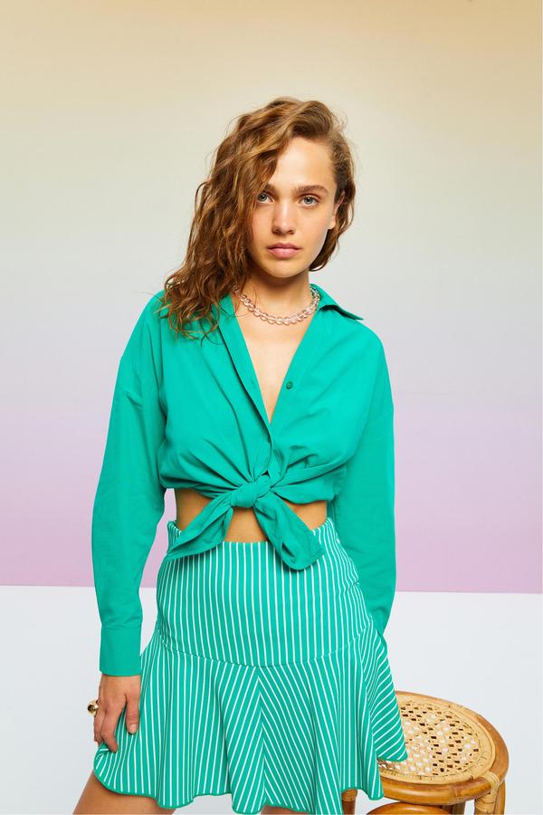Mudo collection etek modelleri arasında volan detaylı a kesim mini etek, çizgili deseniyle hareketlerine eşlik edecek. Çizgili mini kloş etek ile hem spor hem şık bir görüntü yaratabilirsin. Espadriller ve topuklu terliklerle stil sahibi bir görüntü yaratarak farklı tarzlara kolayca ulaşabilirsin.