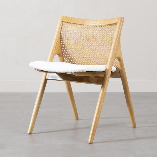 Organik hatlara sahip ahşap çerçevesi sandalyeye zarif bir form kazandırırken, açılı ayak tasarımı modern bir duruş sergiler. Sırt kısmında yer alan rattan detay, tasarıma hem estetik bir derinlik hem de ferah bir görünüm katar. Konforu artırmak için eklenen beyaz minder, uzun süreli oturumlarda rahatlık sağlar. Claus sandalye, yemek masası etrafında ya da salonunuzda tekli bir vurgu parçası olarak kullanılarak doğal ve şık bir dekorasyon stili oluşturmanıza olanak tanır.