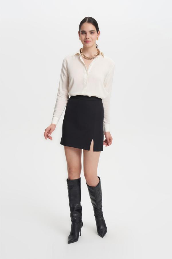 Mudo mini etek modelleri ile şehir kadınını kombinlerine taşı! Ofis ve gece şıklığında sana eşlik edecek yırtmaçlı dar kesim mini eteği, gömlek ve kazak modelleriyle kombinleyebilir, makosen ayakkabılarla feminen duruşunu maskülen bir dokunuşla tamamlayabilirsin.