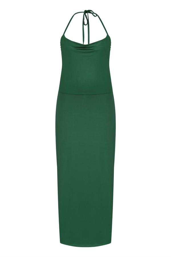 Davetlerde yalın ve dikkat çekici görünümünü dar midi elbise ile güçlendirebilirsin. İnce askısıyla boyundan bağlamalı, esnek kumaşıyla dikkat çeken degaje yaka midi elbise, yırtmaç detayıyla sade tasarıma hareket katıyor. Gece elbisesini ince topuklu sandalet ve portföy çanta ile tamamlayabilir, davetlerde ve partilerde zarafeti yansıtabilirsin.
