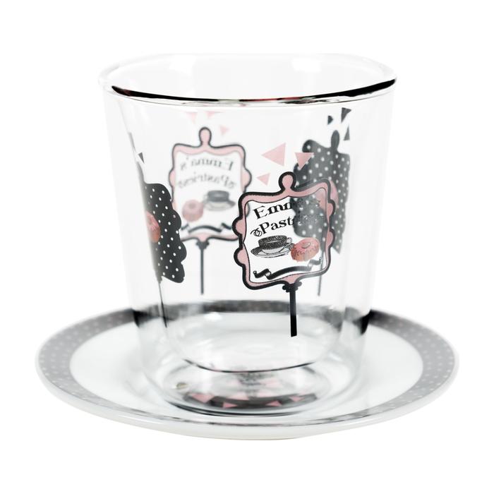 DEKORLU ÇİFT CAM BARDAK & TABAK SET SİYAH