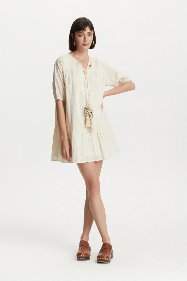 Fisto işlemeriyle vintage esintileri barındıran kısa kollu mini elbise ile sade ve romantik bir görünüme kavuşabilirsin. Deniz kabuğu detaylarıyla tasarımına hareket katan mini elbise %100 pamuk kalitesiyle cildinin de nefes almasını sağlayacak.