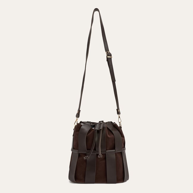 Tasarımında öne çıkan büzgülü ağız detayı, çantaya dinamik bir form kazandırırken, yumuşak dokulu yüzeyi ve parlak deri görünümlü dikey şeritlerin birleşimi dikkat çekici bir kontrast oluşturur. Altın rengi toka detaylarıyla tamamlanan ayarlanabilir omuz askısı ise kişisel konforunuzu ön planda tutar. Modern bucket çanta silüeti ile fonksiyonellik ve estetiği bir arada sunan bu model, günlük kombinlerinize kolayca uyum sağlar.
