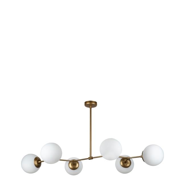 Mudo Concept modern avize modelleri ile dekorasyonunuzu tamamlayın. Yuvarlak mat cam başlıkları ve gold metal gövdesiyle modern tasarımı sunan Destie Horizontal 6'lı Sarkıt Cam-Metal Avize, sade şıklıktan hoşlananlar için tasarlandı.