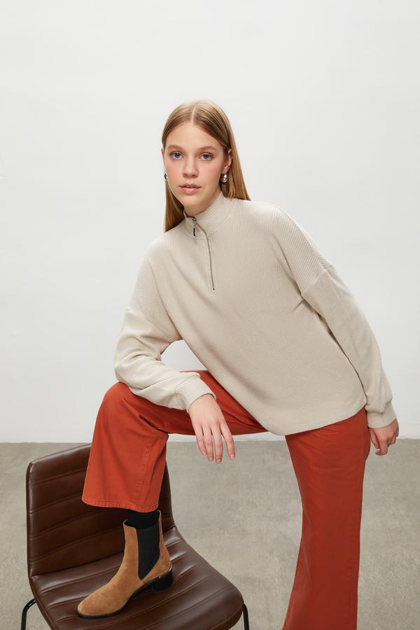 Mudo yarım fermuarlı dik yaka sweatshirt modelleri ile konfor ve şıklık bir arada. İster günlük ister ofis şıklığına dahil edebileceğin dik yaka uzun kollu sweatshirt viskon karışımlı kumaşıyla benzersiz bir doku sunuyor.
