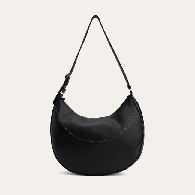Sade ve modern bir tarz sunan dikiş detaylı el çantası, minimalist stili fonksiyonellikle buluşturur. Siyah rengi, farklı kombinlerle kolayca uyum sağlarken, özgün hilal şeklindeki formu çantaya modern ve akıcı bir siluet kazandırır. Kontrast renkli dikişler, tasarımın öne çıkan detaylarından biri olarak çantanın karakterini vurgular.