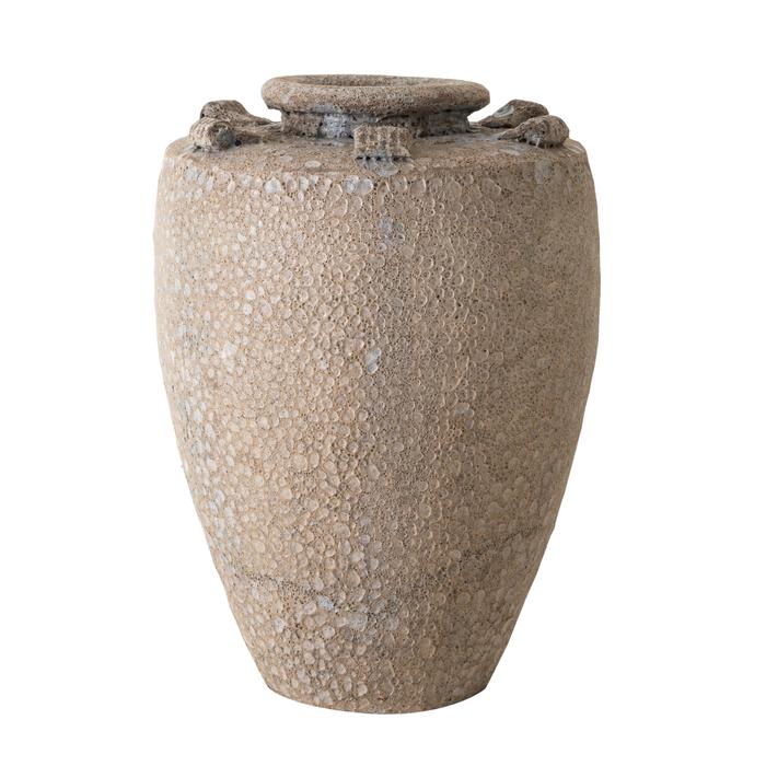 Taş benzeri pürüzlü yüzey dokusu ve bej ile krem tonlarındaki doğal renk paleti, ürünün en belirgin özelliklerindendir. Yüzeyindeki küçük çıkıntılı detaylar, tasarıma el yapımı bir his ve özgünlük katarken, geniş ağız kısmı sayesinde kuru bitkiler veya dallarla zenginleştirilerek etkileyici bir vazo olarak da kullanılabilir. İster bir konsol üzerinde tek başına bir odak noktası olarak sergilensin, ister bir kitaplık rafında diğer dekoratif objelerle bir araya getirilsin, Dumai Küp mekanınıza sıcak ve sofistike bir dokunuş yapar.