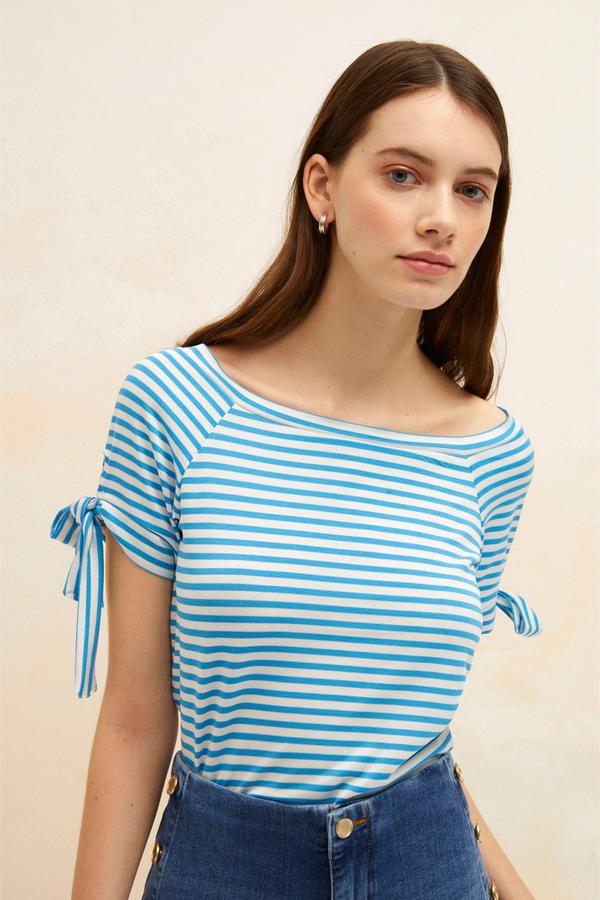 Mudo tişört modelleri ile günlük gardrobunu tamamla! Carmen yaka çizgili tişört modeli, romantik tavrını tasarımında barındırıyor. Jean pantolon ve şort modellerinin yanı sıra, beyaz pantolonlar ile kombinleyebileceğin düşük omuz çizgili tişört modelinin farklı renk seçenekleri bulunuyor.