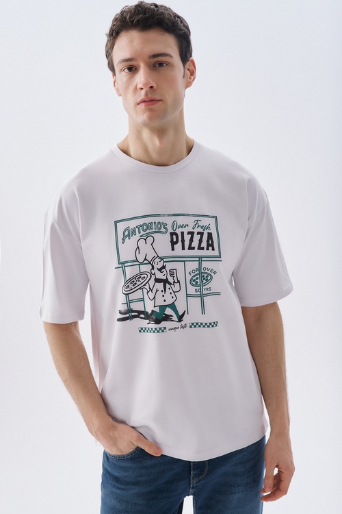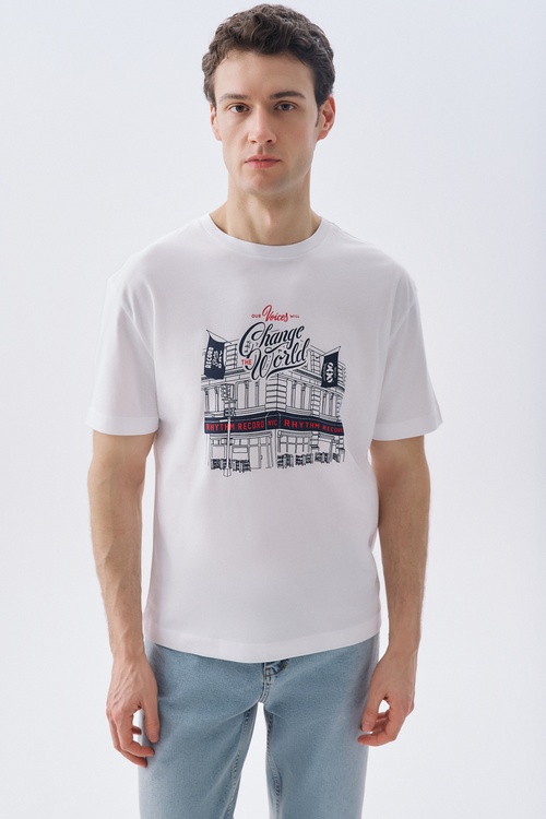 COMFORT FIT BASKILI BİSİKLET YAKA T-SHIRT BEYAZ
