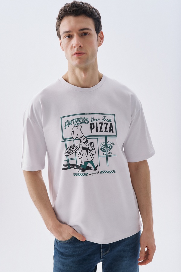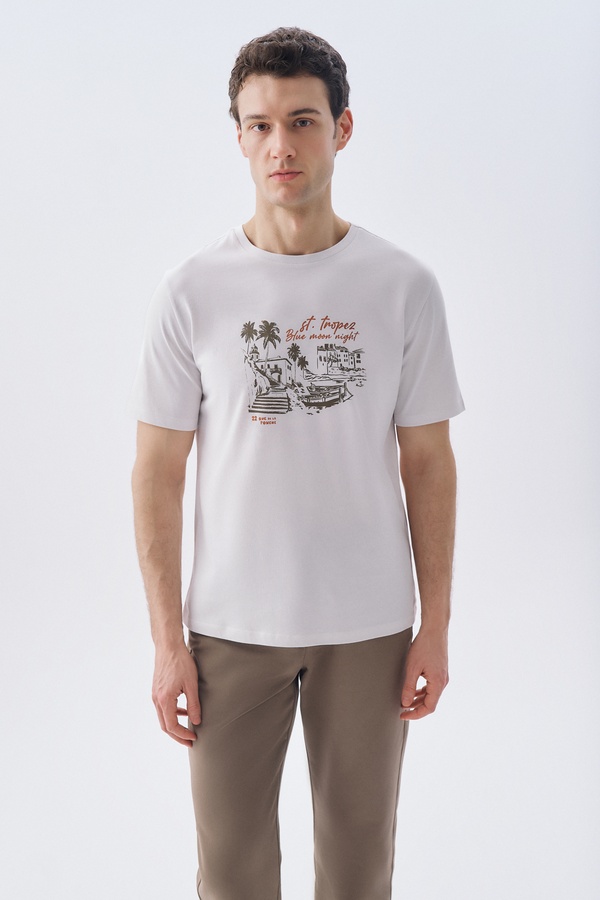 COMFORT FIT BASKILI BİSİKLET YAKA T-SHIRT KIRIK BEYAZ
