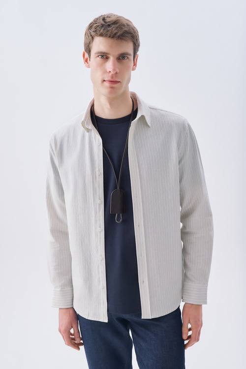 Erkek Haki Çizgili Regular Fit Uzun Kollu Gömlek HAKİ