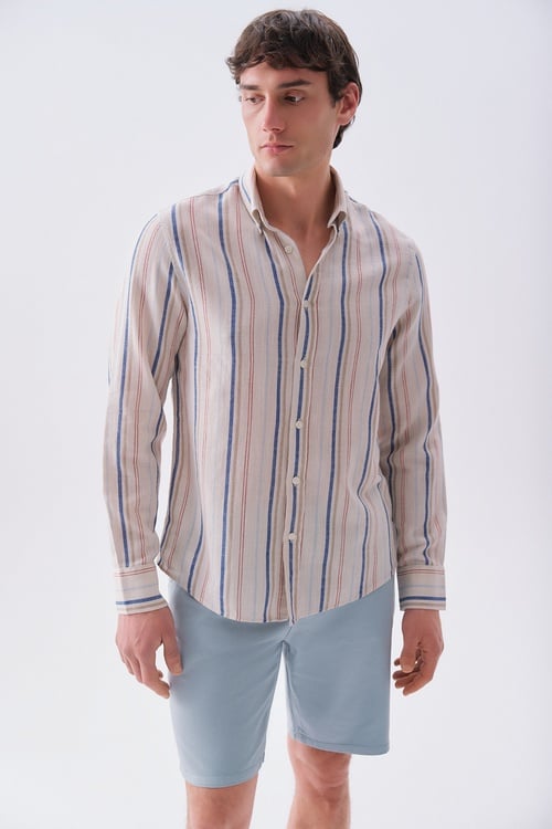 Erkek Siyah Slim Fit Uzun Kollu Keten Gömlek BEJ